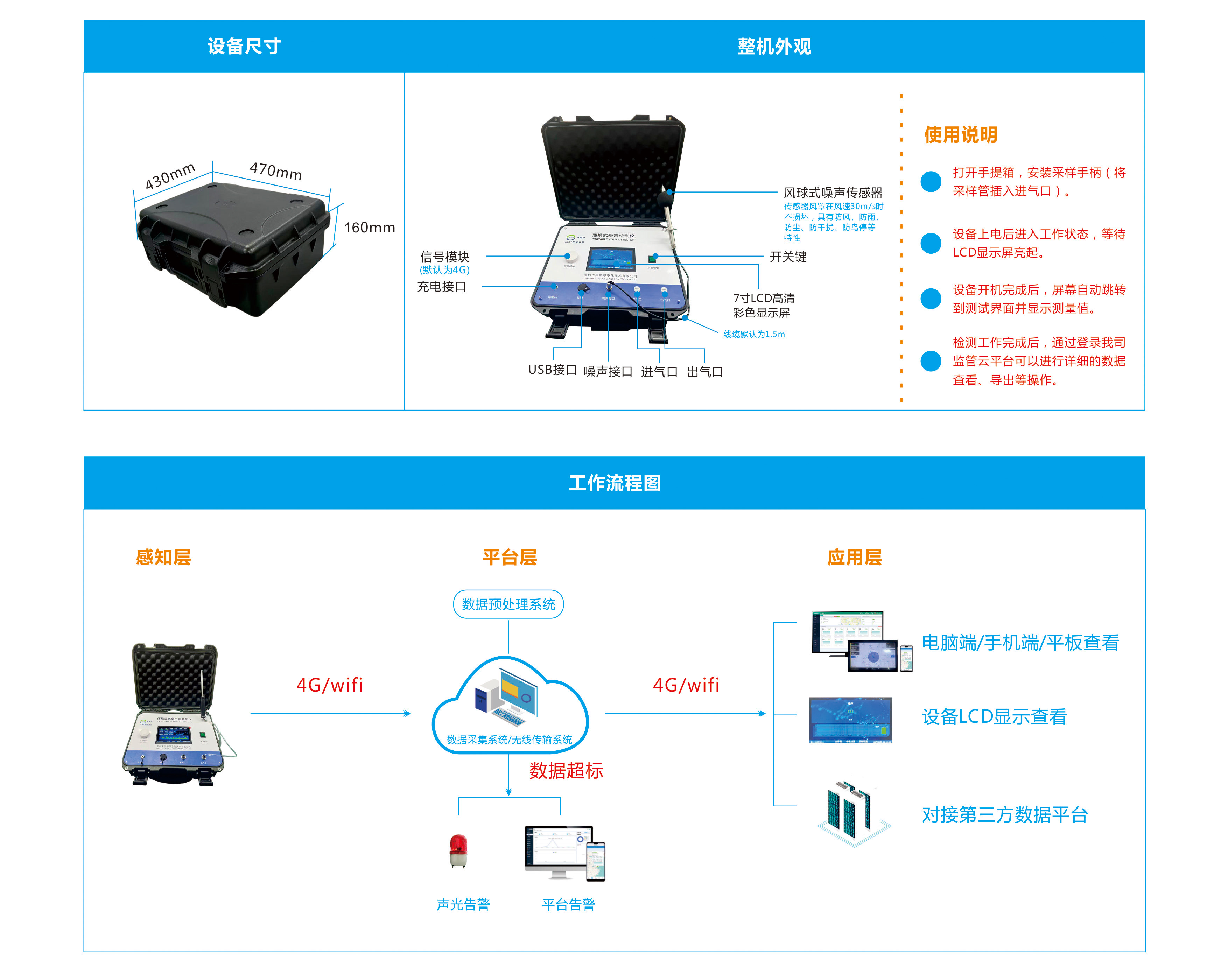 便携式噪声监测仪由户外监测箱、噪声传感器、数据采集统计分析软件、GPRS无线传输模块、服务器云平台软件,微信客户端等部分组成,主要对不同位置、不同时段的噪声进行灵活监测,获取准确的噪声数据,以便及时发现噪声污染问题并采取相应的控制措施。